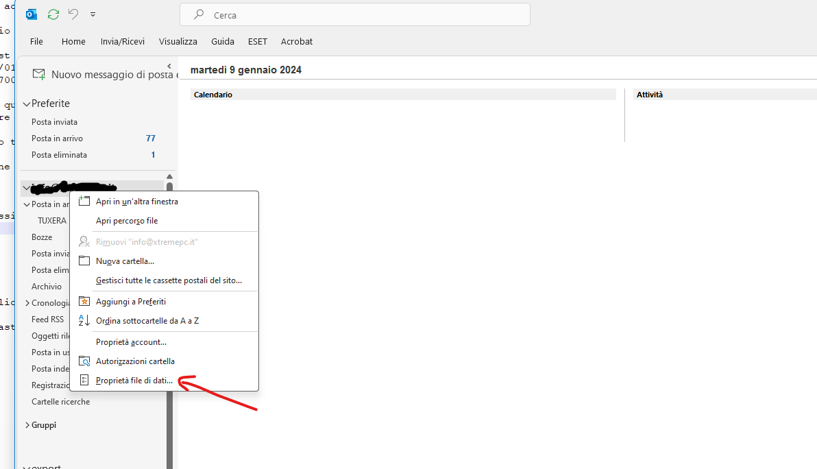– Tasto Dx sulla casella casella mail –>Proprietà file di dati